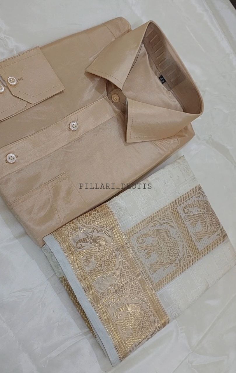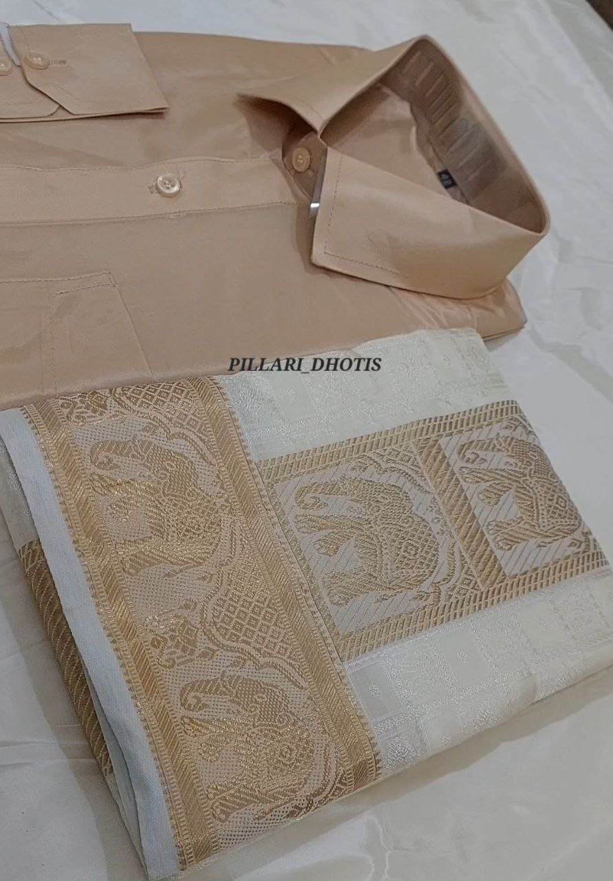 Premium Embossed Designer Elephant Border Dhoti And Gold Shirt Set